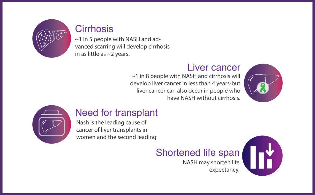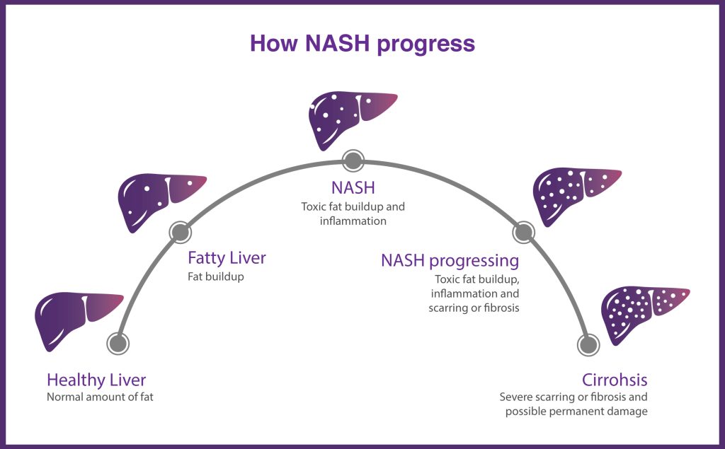 NASH stands for Non-Alcoholic Steatohepatitis. It’s a severe form of non-alcoholic fatty liver disease (NAFLD). NASH progresses from fat accumulation (steatosis) in liver cells, common in obesity or diabetes, to inflammation, causing cell injury and death. This leads to fibrosis (scar tissue formation) and, in advanced stages, cirrhosis, where the liver structure is severely altered. 20% people with fatty liver disease have NASH.
