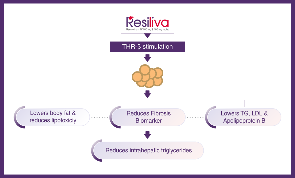 Resiliva (Resmetirom) is a generic version of Rezdiffra which is a thyroid hormone receptor beta (THR-β) agonist. By targeting THR-β, it promotes lipid metabolism in the liver, reducing hepatic fat accumulation and improving lipid profiles. It is the first and only FDA-approved treatment for NASH with liver scarring, along with diet and exercise.